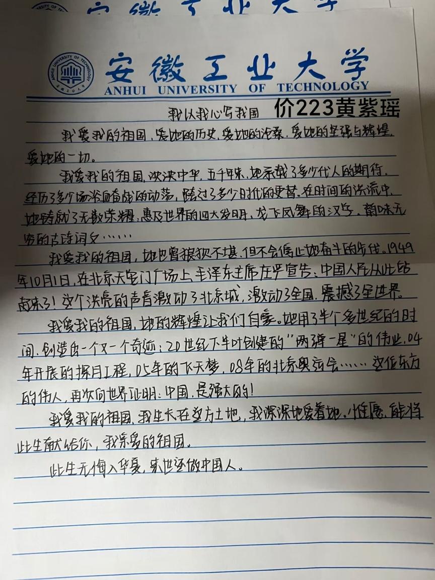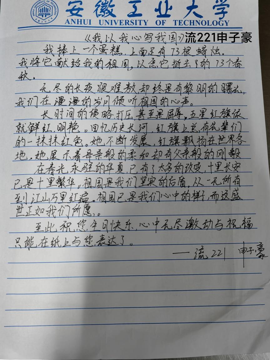 活动前期开展了广泛的宣传动员,鼓励同学们积极参加,抒发自己对祖国的热爱之情。本次活动共有百余名同学积极参加,同学们紧扣主题,结合中国的发展历史写下感悟,用文字记录下自己的感受。有同学写道:“峥嵘岁月72载,如烈火涅磐凤凰、洪水图腾蛟龙,乘百舸争流之势,续中华民族之魂,国之繁盛,盛世鼎立。”字里行间无不洋溢着对国家强大的自豪之情。