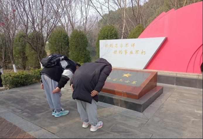 进入烈士陵园后首先映入眼帘的是宽阔而又庄严肃穆的广场,整个墓园沐浴在阳光下,烈士墓隐藏在圆柏林中,红色的墓碑在绿色的映衬下更加显眼肃穆。在一众烈士墓中最显眼的是这样一个简单的墓碑,简单的大理石上刻着象征永垂不朽的金色星星,墓碑上仅留无名烈士墓五字,而他的后面刻着“你的名字不详,你的事业不朽”。队员们知道,在这里安息着的是无数为爱国事业做出贡献的勇士,不管他们的姓名是否被人熟知,但他们的事迹都值得所有中国人铭记。队员们站在墓碑深深鞠躬,久久不愿离开。