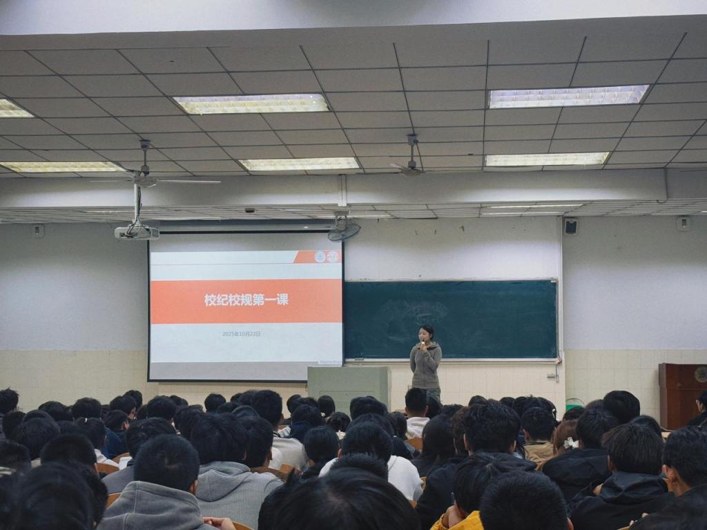 为强化新生纪律意识,规范在校行为,JINNIAN金年会于10月22日在阶教201举行2025级新生“校纪校规第一课”。辅导员李思雨担任主讲,全体2025级新生参加。