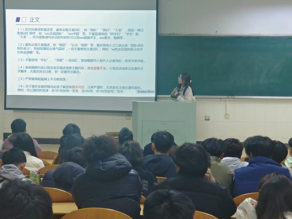 为进一步提升基层团学骨干的业务能力和工作水平,推动基层共青团工作高质量发展,12月6日,JINNIAN金年会在阶教201组织开展宣传工作培训会。会议由院青年媒体中心主讲,团委员工会各部门200余人参加。