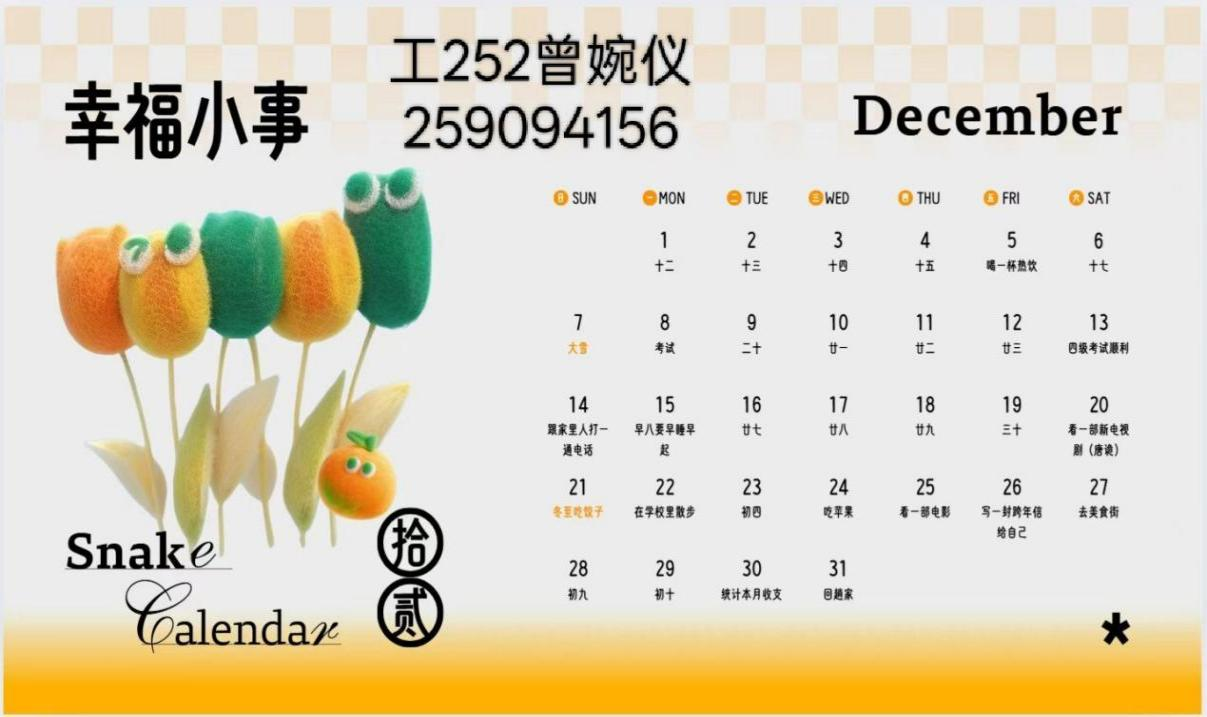 本次活动围绕“十二月幸福小事”展开,鼓励员工通过文字、手绘、图文混排等形式设计幸福清单,将“主动创造幸福”融入日常。活动期间,公司收集到的作品形式多样:手绘日历上,认真标注“每周与家人通话一次”,以亲情陪伴传递温暖;图文笔记中,细致记录“每日留十分钟晒太阳”,在自然时光中捕捉治愈瞬间。参与同学分享道:“原来平凡的日子经过规划,处处藏着温暖”“看到大家的分享才明白,爱自己就是善待每一个日常瞬间”。