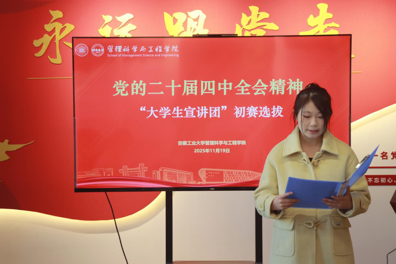 为深入学习贯彻党的二十届四中全会精神,11月19日,JINNIAN金年会在汇文楼A502举办党的二十届四中全会精神“老员工宣讲团”院级选拔赛。2024级辅导员李军慧、2025级辅导员李思雨担任评委。