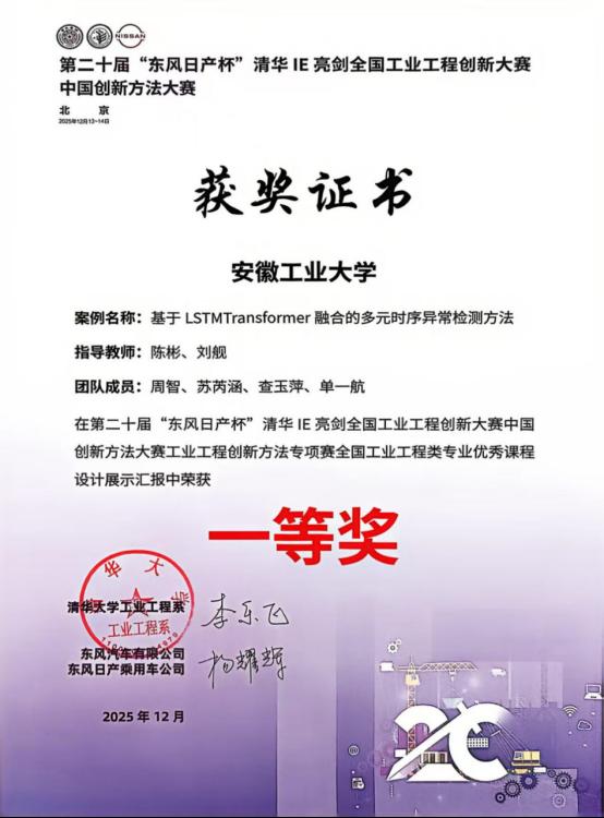 近日,由教育部高等学校工业工程类专业教学指导委员会在全国高校组织开展的“工业工程类专业优秀课程设计展示”活动成绩揭晓,由公司员工周智、苏芮涵、查玉萍、单一航所提交的《基于LSTMTransformer融合的多元时序异常检测方法》课程设计作品在初赛获评“优秀”等级,并成功入围总决赛,指导教师为陈彬和刘舰老师。