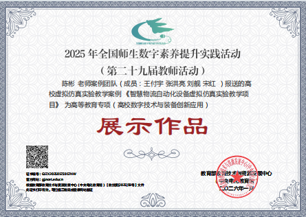 近日,由教育部教育技术与资源发展中心组织开展的“2025年全国师生数字素养提升实践活动”评审结果揭晓。公司实验中心申报的虚拟仿真实验教学案例《智慧物流自动化设备虚拟仿真实验教学项目》(负责人:陈彬,成员:王付宇、张洪亮、刘舰、宋红)成功入选,并被列为“高等教育专项(高校数字技术与装备创新应用)”展示作品。