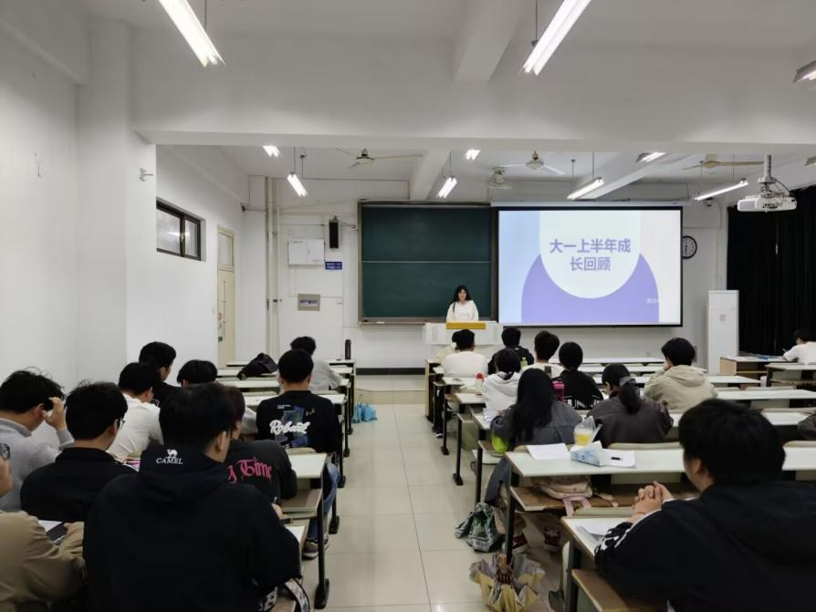 各班级心理委员精心筹备,结合PPT、案例视频等形式,带领同学们回顾大一上学期成长轨迹,梳理收获与不足。围绕情绪管理、自我接纳、压力应对核心主题,讲解心理健康知识,介绍“积极暗示法”等实用调节技巧并组织现场练习,引导同学们正视负面情绪、接纳自身不完美。互动环节中,同学们敞开心扉,分享校园生活的烦恼与感悟,在倾听与倾诉中释放压力、收获支持,凝聚班级向心力。