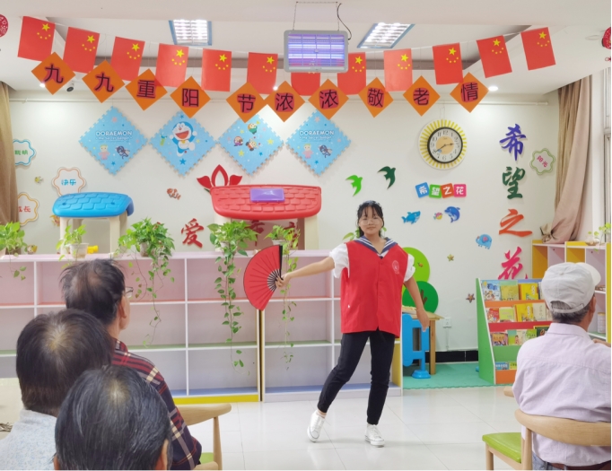 文艺表演。为庆祝重阳节,志愿者们精心为老人们准备了文艺表演活动。头戴红帽、身穿红马甲的11名志愿者们在社区负责人的带领下到达了活动现场,并开始了文艺表演。在歌曲表演《谢谢你》声中,活动拉开了序幕,志愿者们表演了展现老员工们青春活动的歌曲演唱《爱》,老年朋友们喜爱的扇子舞,歌曲合唱《童年》等节目,深受老人们的喜爱。在欢歌笑语中,志愿者们与老人们欢聚一堂,其乐融融。