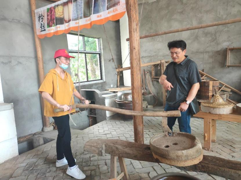 图为实践队员尝试使用磨盘。