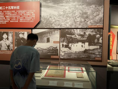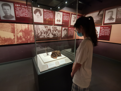 图中为实践队员在历史陈列馆中瞻仰革命文物